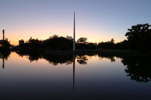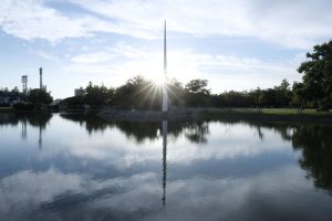 この時期、その手前の池から写すと丁度太陽が塔のあたりに沈むので、