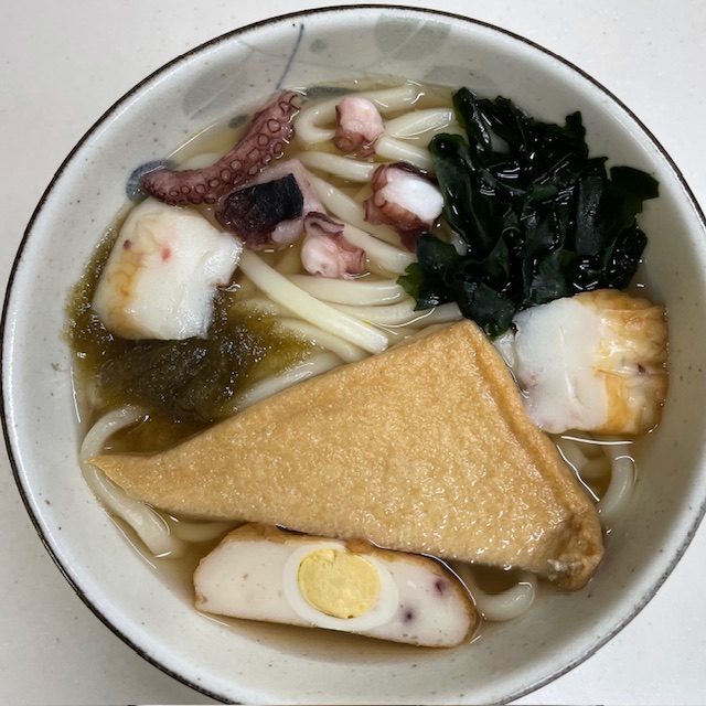 ワタシの今日のお昼ご飯は、タコ・たこ・蛸・うどん・です。